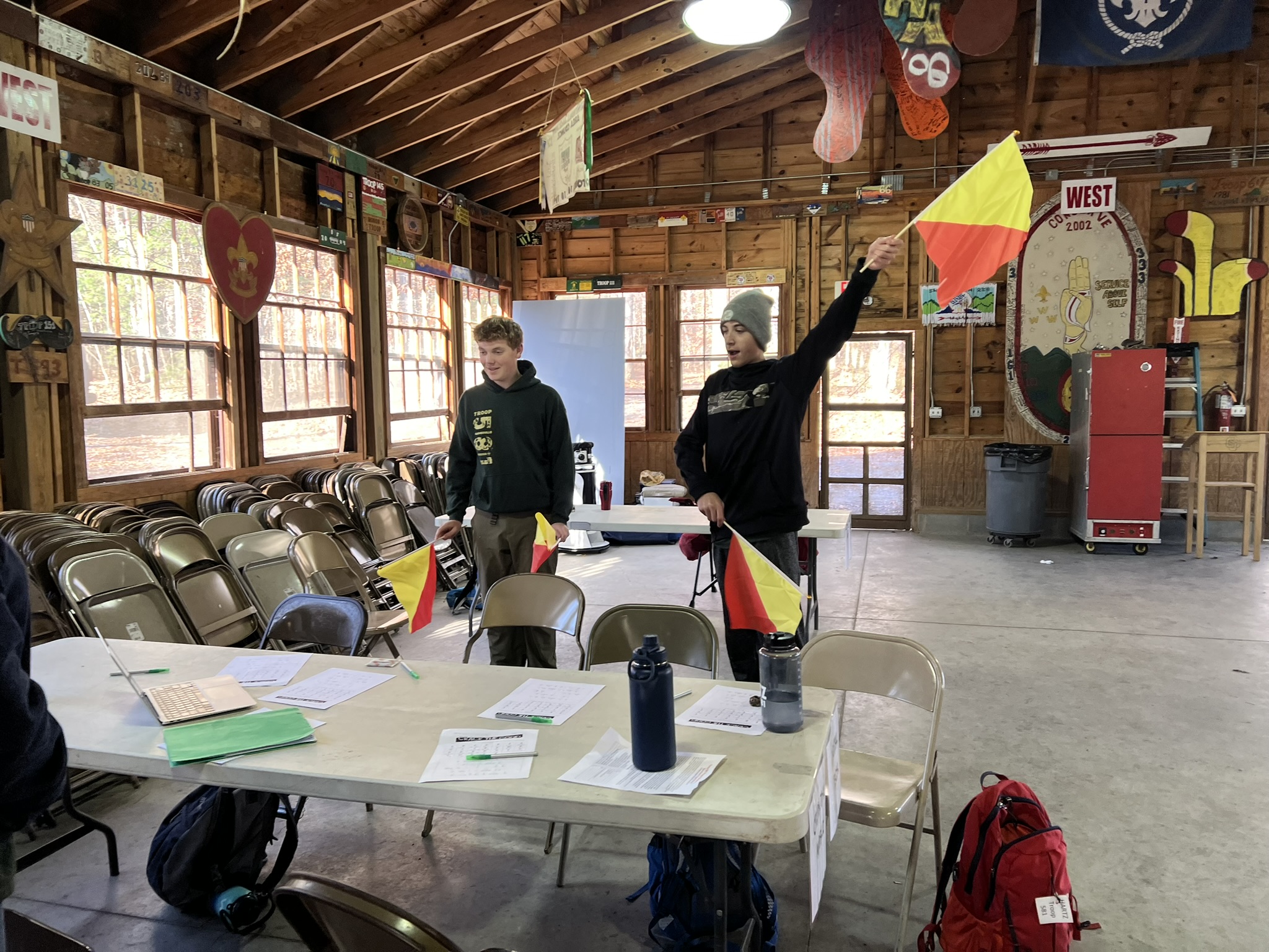 This past November, Troop 581 traveled to Camp Shenandoah located in Swope, VA for its annual ScoutsGiving/Merit Badge campout. Held over the extended Veteran’s Day weekend, Scouts signed up to work on one of the many merit badges offered by the troop. Scouts were able to learn about Robotics, Weather, Camping, Signs, Signals and Codes, Entrepreneurship,  Citizenship, Emergency Preparedness, Fingerprinting, Fire Safety and Astronomy. Then on Sunday evening, the troop hosted its annual ScoutsGiving feast, an early Thanksgiving meal with traditional offerings of turkey, potatoes, and all the trimmings along with an assortment of desserts. The evening concluded with an epic campfire and a round of Scout auctions. Patrols earned tokens throughout the weekend for completed merit badges, good turns and other actions deemed worthy by the Scoutmaster. These tokens could then be used by the patrol to bid on items such as snacks, scout gear and a few hidden items. A great time was had by all.